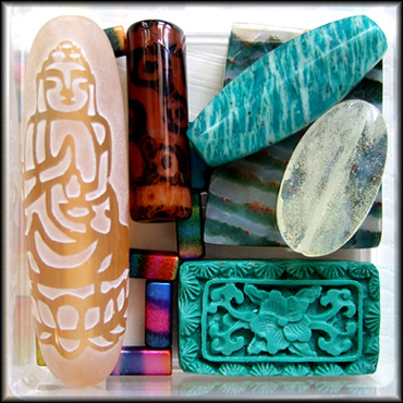 Die Karneol-Perle links mit dem (sandgestrahlten) Buddha ist 5,5 cm